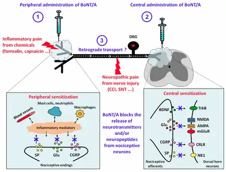 - ↑ Pavone, Flaminia; Luvisetto, Siro (December 2010). "Botulinum Neurotoxin for Pain Management: Insights from Animal Models". Toxins. 2 (12): 2890–2913. doi:10.3390/toxins2122890. ISSN 2072-6651.
