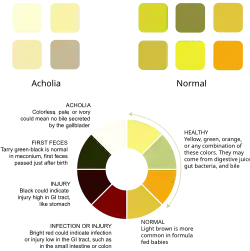 Acholia is pale feces, due to lack of bile which results in the normal brown colour.[2] It is a sign of reduced conjugated bilirubin into the bowel, as a result of a problem in the liver itself or in the biliary tree.[3]