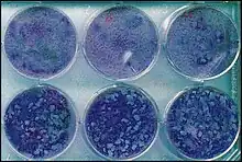 Varicella zoster virus-produced plaques in monolayers of MRC5 cells. When the virus was reproducing each well contained different amounts of the antiviral drug aciclovir. By counting the plaques (holes formed by the virus in the layer of cells) the potency of the aciclovir to the virus was calculated.