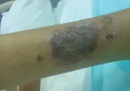 Aciclovir topical cream is commonly associated (≥1% of people) with: dry or flaking skin or transient stinging/burning sensations. Infrequent adverse effects include erythema or itch.[18] When applied to the eye, aciclovir is commonly associated (≥1% of people) with transient mild stinging. Infrequently (0.1–1% of people), aciclovir eye drops is associated with superficial punctate keratitis or allergic reactions.[18]