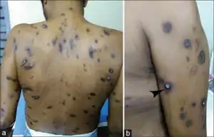 | a) Multiple hyperpigmented papules b) central keratotic plug | |