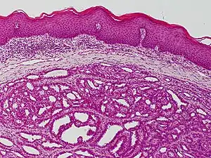 - ↑ 4.0 4.1 4.2 Sawaya JL, Khachemoune A (September 2014). "Poroma: a review of eccrine, apocrine, and malignant forms". International Journal of Dermatology. 53 (9): 1053–61. doi:10.1111/ijd.12448. PMID 24697501.