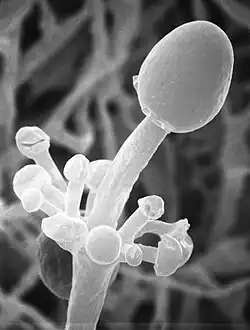 Mycelial growths of A. elegans have a high number of rhizoids branching out of each individual growth. On portions of growth that lack opposite rhizoids, aseptate hyphal growths with clear sporangiophores that are found with extreme variability in length and width. These hyphal structures grow out in whorled structures with growth terminating in the development of sporangiophores.[1][2][3][4][5] The sporangia are oval to spherical in shape and 17–50 μm in diameter. The walls of the sporangia possess prominent spine-like projections, which is a major identifier of this specific fungus.[1] The coloration of colonies of this fungi is white to cream-colored with an abundance of aerial mycelium. Cultures allowed to develop for a longer period of time (greater than 48 hours) change to become yellowish to buff color with increased aerial mycelium development and tight interweaving of these mycelia.[1] When this fungus is found in a human host the structure is explained to be similar to the genus Mucor, but with unique ribbon-like hyphal structures and irregular branching and thickness.[2][4][5]