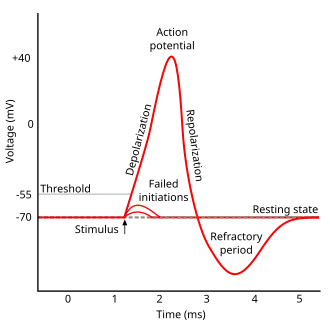 The critical threshold voltage for this runaway condition is usually around −45 mV, but it depends on the recent activity of the axon. A cell that has just fired an action potential cannot fire another one immediately, since the Na+ channels have not recovered from the inactivated state. The period during which no new action potential can be fired is called the absolute refractory period.[40][41][42] At longer times, after some but not all of the ion channels have recovered, the axon can be stimulated to produce another action potential, but with a higher threshold, requiring a much stronger depolarization, e.g., to −30 mV. The period during which action potentials are unusually difficult to evoke is called the relative refractory period.[40][41][42]