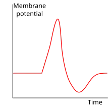 As the membrane potential is increased, sodium ion channels open, allowing the entry of sodium ions into the cell. This is followed by the opening of potassium ion channels that permit the exit of potassium ions from the cell. The inward flow of sodium ions increases the concentration of positively charged cations in the cell and causes depolarization, where the potential of the cell is higher than the cell's resting potential. The sodium channels close at the peak of the action potential, while potassium continues to leave the cell. The efflux of potassium ions decreases the membrane potential or hyperpolarizes the cell. For small voltage increases from rest, the potassium current exceeds the sodium current and the voltage returns to its normal resting value, typically −70 mV.[6][7][8] However, if the voltage increases past a critical threshold, typically 15 mV higher than the resting value, the sodium current dominates. This results in a runaway condition whereby the positive feedback from the sodium current activates even more sodium channels. Thus, the cell fires, producing an action potential.[6][9][10][note 1] The frequency at which a neuron elicits action potentials is often referred to as a firing rate or neural firing rate.