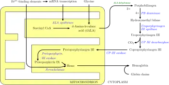 Heme synthesis—note that some reactions occur in the cytoplasm and some in the mitochondrion (yellow)