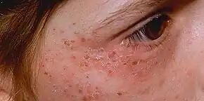 • Vesiculo-erosive skin disease. This—a reference to the characteristic blistering (vesicles) and open sores (erosions) noted in patients—is the pattern seen in CEP, PCT, VP, and HCP. The changes are noted only in sun-exposed areas such as the face and back of the hands. Milder skin disease, such as that seen in VP and HCP, consists of increased skin fragility in exposed areas with a tendency to form blisters and erosions, particularly after minor knocks or scrapes. These heal slowly, often leaving small scars that may be lighter or darker than normal skin. More severe skin disease is sometimes seen in PCT, with prominent lesions, darkening of exposed skin such as the face, and hypertrichosis: abnormal hair growth on the face, particularly the cheeks. The most severe disease is seen in CEP and a rare variant of PCT known as hepatoerythropoietic porphyria (HEP); symptoms include severe shortening of digits, loss of skin appendages such as hair and nails, and severe scarring of the skin with progressive disappearance of ears, lips, and nose. Patients may also show deformed, discolored teeth or gum and eye abnormalities.