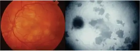 | Bilateral confluent yellowish fundus lesions | |