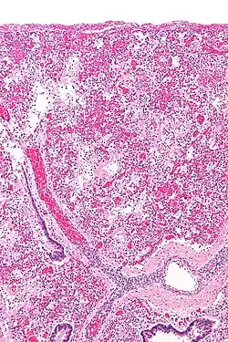 ARDS is a form of fluid accumulation in the lungs not explained by heart failure (noncardiogenic pulmonary edema). It is typically provoked by an acute injury to the lungs that results in flooding of the lungs' microscopic air sacs responsible for the exchange of gases such as oxygen and carbon dioxide with capillaries in the lungs.[12] Additional common findings in ARDS include partial collapse of the lungs (atelectasis) and low levels of oxygen in the blood (hypoxemia). The clinical syndrome is associated with pathological findings including pneumonia, eosinophilic pneumonia, cryptogenic organizing pneumonia, acute fibrinous organizing pneumonia, and diffuse alveolar damage (DAD). Of these, the pathology most commonly associated with ARDS is DAD, which is characterized by a diffuse inflammation of lung tissue. The triggering insult to the tissue usually results in an initial release of chemical signals and other inflammatory mediators secreted by local epithelial and endothelial cells.