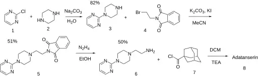 2-Chloropyrimidine (1) reacts with piperazine (2), forming 2-(1-piperazinyl)pyrimidine (3). Treatment with the phthalimide derivative N-(2-bromoethyl)phthalimide (4) in an alkylation reaction produces (5), which is deprotected using hydrazine to give the primary amine (6). Amide formation with the acid chloride of 1-adamantanecarboxylic acid yields adatanserin.[6][3]
