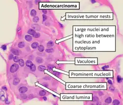 | Histopathology of typical features of adenocarcinoma on H&E stain, but in reality the visual features vary substantially, both by subtypes of adenocarcinoma as well as between individual cases. | |