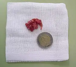 Adenoidectomy is the surgical removal of the adenoid for reasons which include impaired breathing through the nose, chronic infections, or recurrent earaches. The effectiveness of removing the adenoids in children to improve recurrent nasal symptoms and/or nasal obstruction has not been well studied.[1] The surgery is less commonly performed in adults in whom the adenoid is much smaller and less active than it is in children. It is most often done on an outpatient basis under general anesthesia. Post-operative pain is generally minimal and reduced by icy or cold foods. The procedure is often combined with tonsillectomy (this combination is usually called an "adenotonsillectomy" or "T&A"), for which the recovery time is an estimated 10–14 days, sometimes longer, mostly dependent on age.