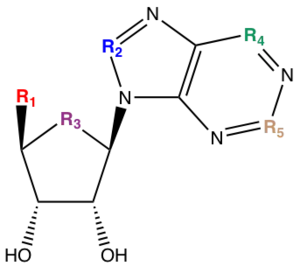 To meet the need of the reversible orally drug ticagrelor the phosphate chain of cangrelor was replaced with an aspartic acid, resulting in 300 fold reduction in potency. The potency of ticagrelor was brought back to the same level as cangrelor by changing the purine with triazolopyrimidine. The sugar ribose unit was also replaced with a cyclopentyl group to avoid possible instability of the glycosidic bond. The group at the left hand side of the structure was replaced with the sidecain R1. The neutral sidechain R1=CONH2 and R1=CH2OH were accepted with slight loss of affinity and the metabolism had shifted from biliary to hepatic metabolism. Because of this, in vitro hepatic microsomal assays could be used which simplified the optimization of pharmacokinetic properties. Addition of phenyl cyclopropylamine substituent in the 5 position gave high affinities. From this the first compound was found to have measurable oral bioavailability in rats (R1 =CH2OH). Variation of R2 had minor impact on affinity that allowed introduction of groups to improve pharmacokinetic properties, for example R1=OCH2CH2OH. The introduction of fluorines at the phenyl ring and at the end of the thioether alkylchain leads to further improved metabolic stability. By replacing the fluorines at the thioether alkylchain back to S-propyl it leads to the formulation of ticagrelor.[23]