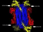 The family of enzymes to which ADSL belongs and that catalyze β-eliminations in which fumarate is one of the products are homotetramers with four active sites composed of amino acid residues from three distinct subunits. Much is known about the active site of human ADSL due to studies of the active site in the B. subtilis ADSL through affinity labeling and site-directed mutagenesis. While there is some variability among species in the sequencing of ADSL, the active site of the enzyme contains many residues that are conserved across species and have been shown to be critical to the enzyme's function. His68 and His141 seem to serve as the general acid and base catalysts, and are critical to the catalyzing reaction of the substrate. His89 seems to enhance the binding of the substrate's phosphoryl group and orient adenylosuccinate for catalysis. All three histidines are conserved throughout the 28 species for which the structure of ADSL is known. Glu275 and Lys268 have also been shown to contribute to the active site, indicating there are four active sites, each of which is formed from regions of three subunits.[9] ADSL deficiency in different people is often caused by different mutations to the enzyme, more than 50 different mutations in the ADSL gene have been discovered[10]