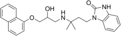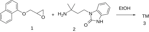 The reaction between 1-naphthyl glycidyl ether (1) and 3-(3-amino-3-methylbutyl)-1H-benzimidazol-2-one (2) gives adimolol (3).[2][3]