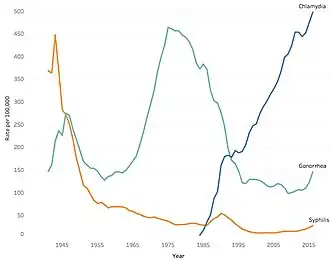 - ↑ Table 1. Sexually Transmitted Diseases — Reported Cases and Rates of Reported Cases per 100,000 Population, United States, 1941–2016, Centers for Disease Control and Prevention, September 26, 2017