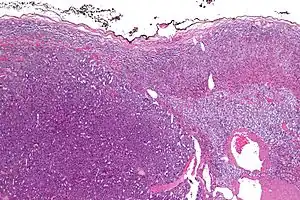 Micrograph of an adrenocortical carcinoma (left of image – dark blue) and the adrenal cortex it arose from (right-top of image – pink/light blue). Benign adrenal medulla is present (right-middle of image – gray/blue). H&E stain.