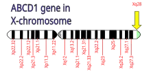 ALD is caused by mutations in ABCD1, located at Xq28 and demonstrates X-linked recessive inheritance. The gene ABCD1 encodes a peroxisomal membrane transporter which is responsible for transporting very long chain fatty acid substrate into the peroxisomes for degradation.[5] Mutations in this gene that interfere with this process cause this syndrome.