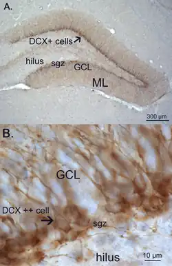 - ↑ Bayer SA (1982). "Changes in the total number of dentate granule cells in juvenile and adult rats: a correlated volumetric and 3H-thymidine autoradiographic study". Experimental Brain Research. Experimentelle Hirnforschung. Experimentation Cerebrale. 46 (3): 315–323. doi:10.1007/bf00238626. PMID 7095040. S2CID 18663323.