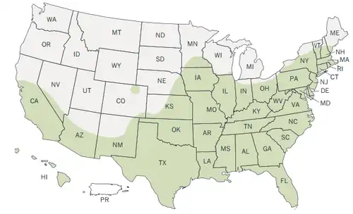 In the United States, this species invaded the Southern United States in the 1980s and rapidly spread northward into novel climate compared to its native range.[47] It was initially found in 1983 in Memphis, Tennessee.[48] then at the Port of Houston in a 1985 shipment of used tires,[49] and spread across the South up the East Coast to become prevalent in the Northeast.[50] It was not discovered in Southern California until 2001, then eradicated for over a decade; however, by 2011, it was again being found in Los Angeles County traps, then over the next two years expanded its range to Kern County and San Diego County.[51][52][53] As of 2013, North American land favoring the environmental conditions of the Asian tiger mosquito was expected to more than triple in size in the coming 20 years, especially in urban areas.[54] As of 2017 Aedes albopictus mosquitoes have been identified in 1,368 counties in 40 U.S states.[55][56] A 2019 study in Nature Microbiology that modeled expansion of Aedes albopictus due to climate change, urbanization, and human movement found that the species would likely continue to spread throughout the coming decades.[57]