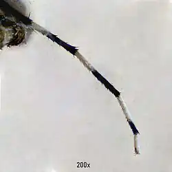 The adult Asian tiger mosquito is less than 10 mm (0.39 in) long from end to end with a striking white and black pattern.[7][15][16] The variation of the body size in adult mosquitoes depends on the density of the larval population and food supply within the breeding water. Since these circumstances are seldom optimal, the average body size of adult mosquitoes is considerably smaller than 10 mm. For example, the average length of the abdomen was calculated to be 2.63 mm (0.104 in), the wings 2.7 mm (0.11 in), and the proboscis 1.88 mm (0.074 in).[17]