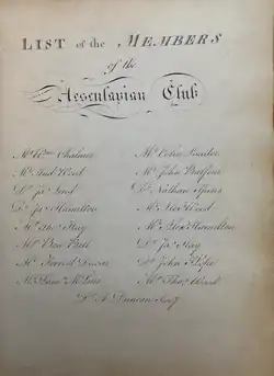 The Aesculapian Club of Edinburgh is one of the oldest medical dining clubs in the world. It was founded in April 1773 by Dr. Andrew Duncan.[1][2][3] Membership of the club is limited to 11 Fellows of the Royal College of Physicians of Edinburgh and 11 Fellows of the Royal College of Surgeons of Edinburgh. 'Extraordinary Membership' is given to members aged over 70 years. The club was established during the Scottish Enlightenment to encourage convivial relations between Fellows of the two Colleges and to stimulate intellectual discussion. The Club dinners are held in the New Library of the Royal College of Physicians of Edinburgh on the 2nd Friday of March and October each year.[4] The principal guest at each dinner is invited to give a short talk on a non-medical subject and this is followed by a round-table discussion.[4][5]