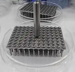 Another way of plating organisms, next to streaking, on agar plates is the spot analysis. This type of analysis is often used to check the viability of cells and is performed with pinners (often also called froggers). A third technique is using sterile glass beads to plate out cells. In this technique, cells are grown in a liquid culture, in which a small volume is pipetted on the agar plate and then spread out with the beads. Replica plating is another technique used to plate out cells on agar plates. These four techniques are the most common, but others are also possible. It is crucial to work in a sterile manner to prevent contamination on the agar plates.[1] Plating is thus often done in a laminar flow cabinet or on the working bench next to a bunsen burner.[2]