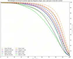 - ↑ Arias, Elizabeth; Xu, Jiaquan (22 March 2022). "United States Life Tables, 2019" (PDF). National Vital Statistics Reports. 70 (19). National Center for Health Statistics: 10–45. PMID 35319436. — Tables 1–18