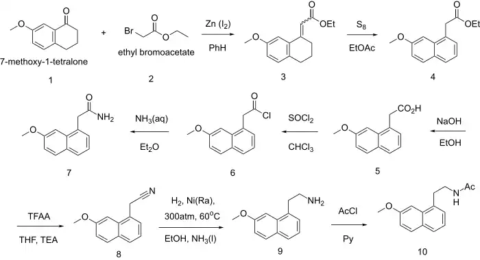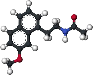 - ↑ Tinant B, Declercq JP, Poupaert JH, Yous S, Lesieur D (1994). "N-[2-(7-Methoxy-1-naphthyl)ethyl]acetamide, a potent melatonin analog". Acta Crystallogr. C. 50 (6): 907–910. doi:10.1107/S0108270193012922.