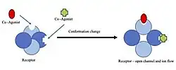 As mentioned above, agonists have the potential to bind in different locations and in different ways depending on the type of agonist and the type of receptor.[9] The process of binding is unique to the receptor-agonist relationship, but binding induces a conformational change and activates the receptor.[9][10] This conformational change is often the result of small changes in charge or changes in protein folding when the agonist is bound.[10][11] Two examples that demonstrate this process are the muscarinic acetylcholine receptor and NMDA receptor and their respective agonists.