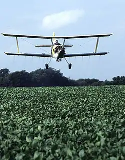 Aerial application (crop dusting) of pesticides over a soybean field in the U.S.