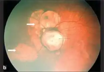 - Eye abnormalities known as "lacunae" of the retina that are quite specific to this disorder; optic nerve coloboma; and