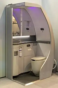 An aircraft lavatory or plane toilet is a small unisex room on an aircraft with a toilet and sink. They are commonplace on passenger flights except some short-haul flights. Aircraft toilets were historically chemical toilets, but many now use a vacuum flush system instead.