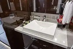 Fitted cabinets may contain additional toilet paper and other toiletries, but they are often locked or have discreet release mechanisms. A common release mechanism is under the mirror/sink area. A little button is presented if, when pressed, will open the mirror up to show products, such as toilet paper, lavatory soap, feminine hygiene products, and more. The toilet and sink are often moulded plastic or a stainless steel sink; the floor is usually a non-slip surface. In newer aircraft, the executive or first class lavatories are roomier and offer more toiletries and other comforts.