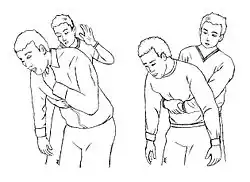 Treatment includes different maneuvers that aim to remove the foreign body that is obstructing the airway. This type of obstruction most often occurs when someone is eating or drinking. Most modern protocols, including those of the American Heart Association, American Red Cross and the European Resuscitation Council,[5] recommend several stages, designed to apply increasingly more pressure. Most protocols recommend first encouraging the patient to cough, and allowing them an opportunity to spontaneously clear the foreign body if they are coughing forcefully. If the person's airway continues to be blocked, more forceful maneuvers such as hard back slaps and abdominal thrusts (Heimlich maneuver) can be performed. Some guidelines recommend alternating between abdominal thrusts and back slaps while others recommend the same starting with the back slaps first.[5] Having the person lean forward reduces the chances of the foreign body going back down the airway when coming up.[6]