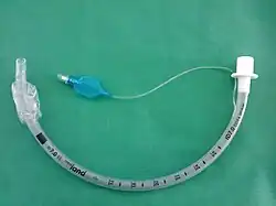 Extraglottic devices are another family of supraglottic devices that are inserted through the mouth to sit on top of the larynx.[27] Extraglottic devices are used in the majority of operative procedures performed under general anaesthesia.[28] Compared to a cuffed tracheal tube, extraglottic devices provide less protection against aspiration but are more easily inserted and causes less laryngeal trauma.[27] Limitations of extraglottic devices arise in morbidly obese patients, lengthy surgical procedures, surgery involving the airways, laparoscopic procedures and others due to its bulkier design and inferior ability to prevent aspiration.[29] In these circumstances, endotracheal intubation is generally preferred. The most commonly used extraglottic device is the laryngeal mask airway (LMA). An LMA is a cuffed perilaryngeal sealer that is inserted into the mouth and set over the glottis. Once it is in its seated position, the cuff is inflated.[30] Other variations include devices with oesophageal access ports, so that a separate tube can be inserted from the mouth to the stomach to decompress accumulated gases and drain liquid contents.[27] Other variations of the device can have an endotracheal tube passed through the LMA and into the trachea.[27]