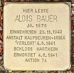 More pressure was placed on parents to agree to their children being sent away. Many parents suspected what was happening and refused consent, especially when it became apparent that institutions for children with disabilities were being systematically cleared of their charges. The parents were warned that they could lose custody of all their children and if that did not suffice, the parents could be threatened with call-up for 'labour duty'.[63] By 1941, more than 5,000 children had been killed.[42][h] The last child to be killed under Aktion T4 was Richard Jenne on 29 May 1945, in the children's ward of the Kaufbeuren-Irsee state hospital in Bavaria, Germany, more than three weeks after US Army troops had occupied the town.[64][65]