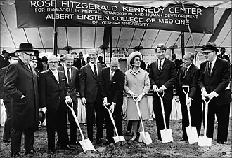 The Ullmann Research Center for Health Sciences, a 12-story facility, opened in 1964.[25] The following year, the Joseph P. Kennedy Jr. Foundation donated $1.45 million to Einstein to establish a center to study human development and mental disabilities.[26][note 3] The center, named for Rose F. Kennedy, opened with 200 staff scientists in 1970.[3][29] Also that year, the college began construction on the 15-story Charles C. and Beulah Bassine Educational Center devoted to public health.[30] Beginning in 1971, aided by a five-year, $12,157,000 federal grant, the college experimented with a 3-year MD degree pathway and increased class sizes.[31]