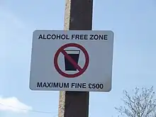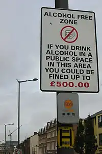 An alcohol-free zone, or dry zone, is a geographic area, location or establishment where the public consumption and sale of alcoholic beverages is prohibited.[2][3] Alcohol-free zones have been established in some areas to address problems with drinking- and binge drinking-related crime, antisocial behavior, assaults and disorderly behavior.[4][5] Alcohol-free zones have been opposed in some communities, such as in Bath, England, which has "a tradition of open-air bars and restaurants."[4]