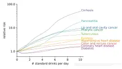 - ↑ Wood AM, Kaptoge S, Butterworth AS, Willeit P, Warnakula S, Bolton T, et al. (2018). "Risk thresholds for alcohol consumption: combined analysis of individual-participant data for 599 912 current drinkers in 83 prospective studies". The Lancet. 391 (10129): 1513–1523. doi:10.1016/S0140-6736(18)30134-X. PMC 5899998. PMID 29676281.