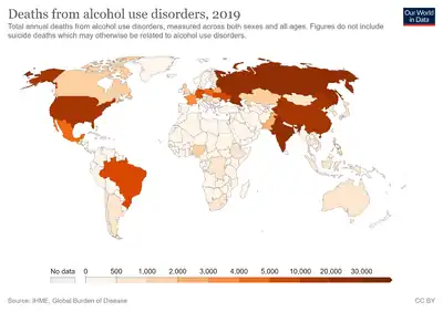 - ↑ 19.0 19.1 GBD 2016 Alcohol Collaborators (August 2018). "Alcohol use and burden for 195 countries and territories, 1990-2016: a systematic analysis for the Global Burden of Disease Study 2016". Lancet. 392 (10152): 1015–1035. doi:10.1016/S0140-6736(18)31310-2. PMC 6148333. PMID 30146330.