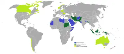 Some majority-Muslim countries, such as Saudi Arabia, Kuwait, Pakistan, Iran, Somalia, Libya, Yemen, etc prohibit the production, sale, and consumption of alcoholic beverages either entirely or for its Muslim citizens because they are considered haram (forbidden) in Islam.[10][11][12] Alcohol was illegal in Sudan but, it was legalized for non-Muslims in July 2020. Other Muslim countries have it either illegal in certain parts or by non-Muslims.[13]