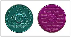 Sobriety token or "chip", given for specified lengths of sobriety, on the back is the Serenity Prayer. Here green is for six months of sobriety; purple is for nine months.