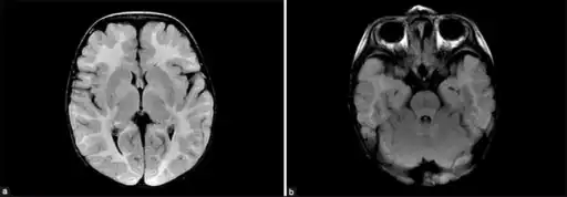 a,b) MRI of brain shows increased signal intensity -cortical/sub cortical white matter