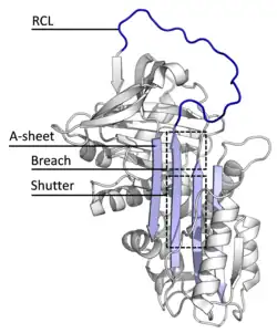 - ↑ Gettins PG (December 2002). "Serpin structure, mechanism, and function". Chemical Reviews. 102 (12): 4751–804. doi:10.1021/cr010170. PMID 12475206.