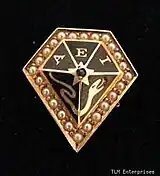 The official badge is described as a "black enameled faceted pentagon, having a gold star at the apex with an emerald inset. The three upper facets contained the Greek letters Α Ε Ι in gold, the two lower facets, a gold serpent."