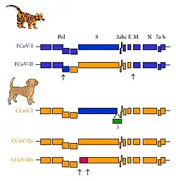 - ↑ Le Poder, Sophie (2011-07-31). "Feline and Canine Coronaviruses: Common Genetic and Pathobiological Features". Advances in Virology. 2011 609465. doi:10.1155/2011/609465. PMC 3265309. PMID 22312347.