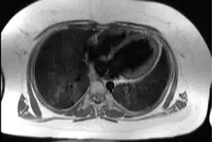 | Transaxial image of the chest at the level of the heart illustrating the typical degree of subcutaneous and epicardial adipose tissue (shown in white) in a patient with Alström syndrome; hence the difficulty in imaging by echocardiography | |