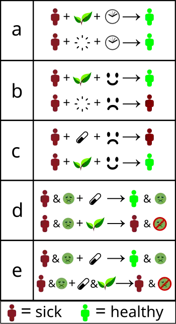 b) Placebo effect or false treatment effect – an individual receives "alternative therapy" and is convinced it will help. The conviction makes them more likely to get better.