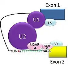 Splicing of mRNA is performed by an RNA and protein complex known as the spliceosome, containing snRNPs designated U1, U2, U4, U5, and U6 (U3 is not involved in mRNA splicing).[25] U1 binds to the 5' GU and U2, with the assistance of the U2AF protein factors, binds to the branchpoint A within the branch site. The complex at this stage is known as the spliceosome A complex. Formation of the A complex is usually the key step in determining the ends of the intron to be spliced out, and defining the ends of the exon to be retained.[6] (The U nomenclature derives from their high uridine content).